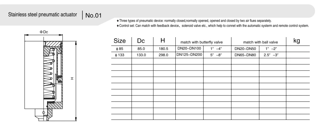 - Привід односторонньої дії: приводиться в рух повітрязабірником з одного боку, інша сторона покладається на силу пружини для автоматичного скидання в початковий стан у разі збою подачі повітря. Це забезпечує безпечну роботу трубопроводу та запобігає потенційній загрозі безпеці у разі збою системи подачі повітря.